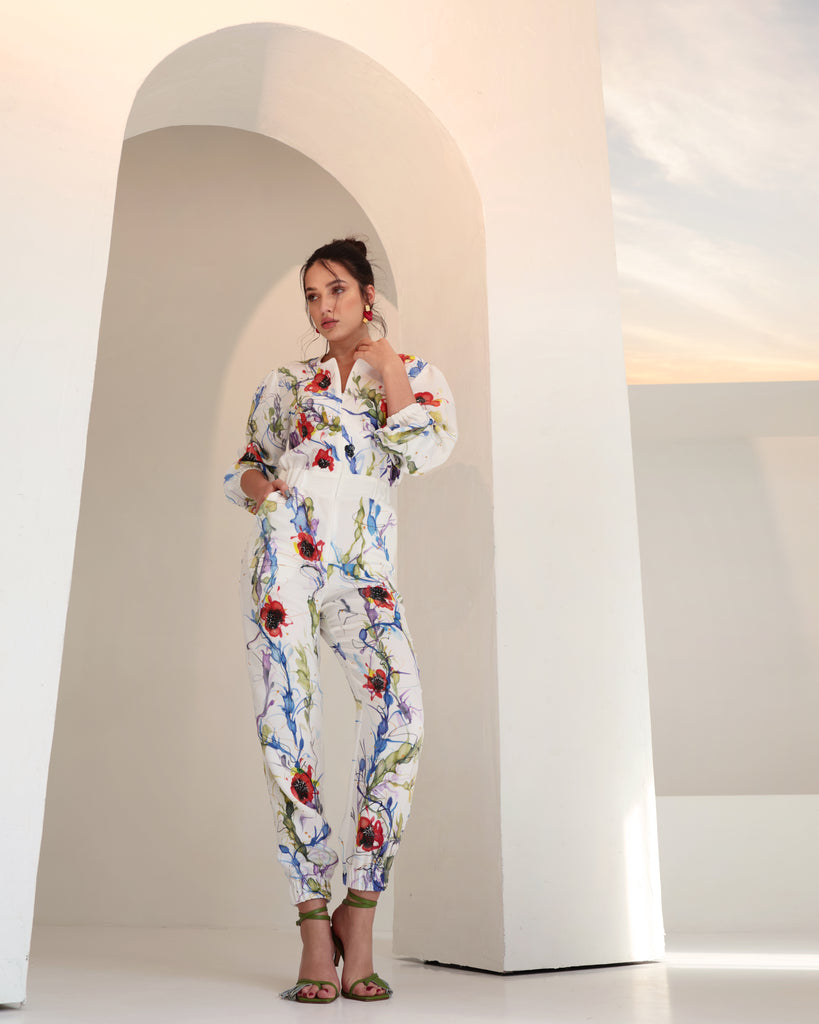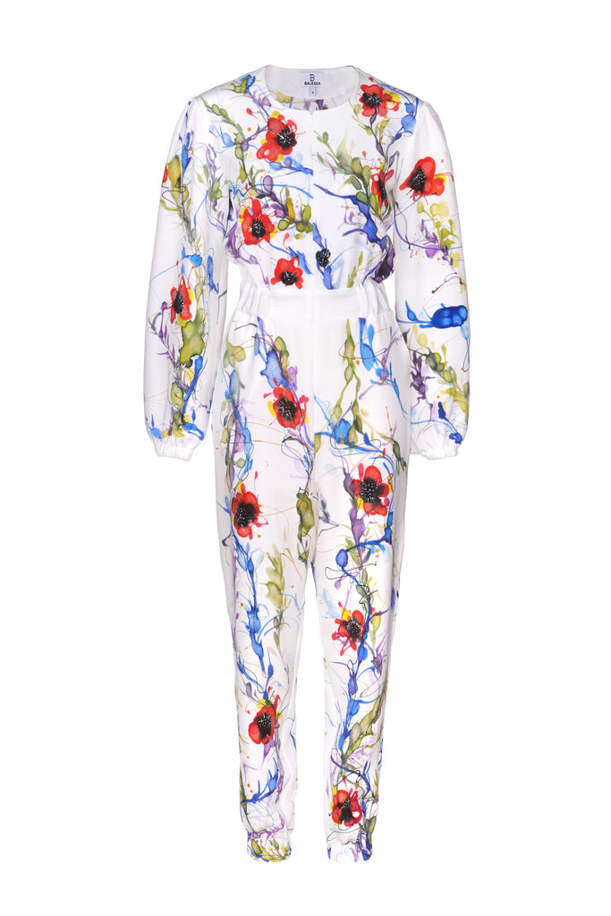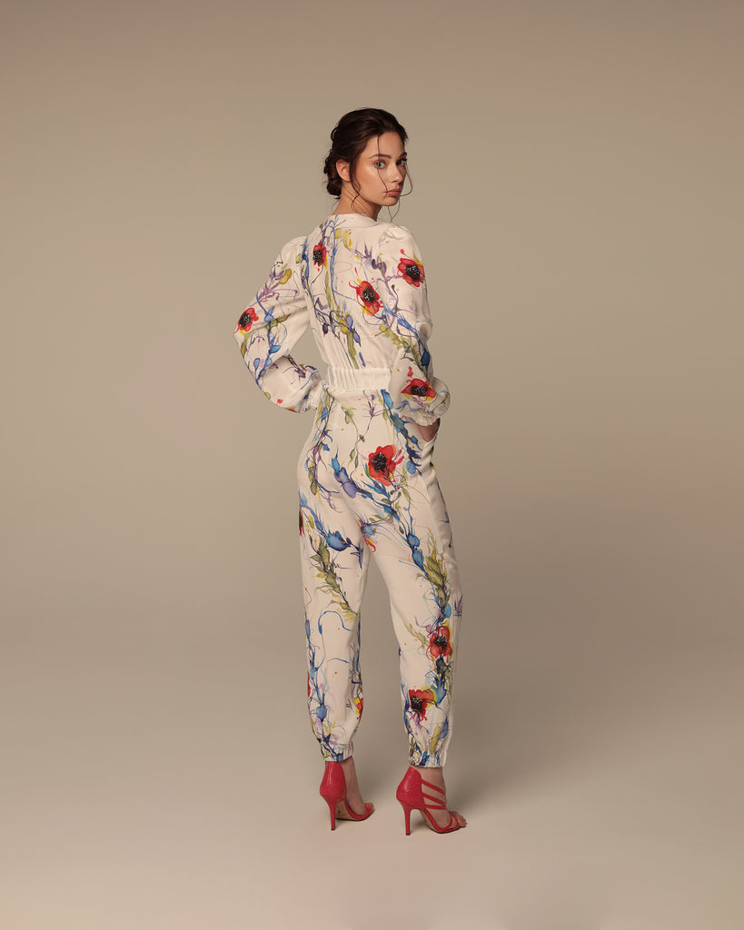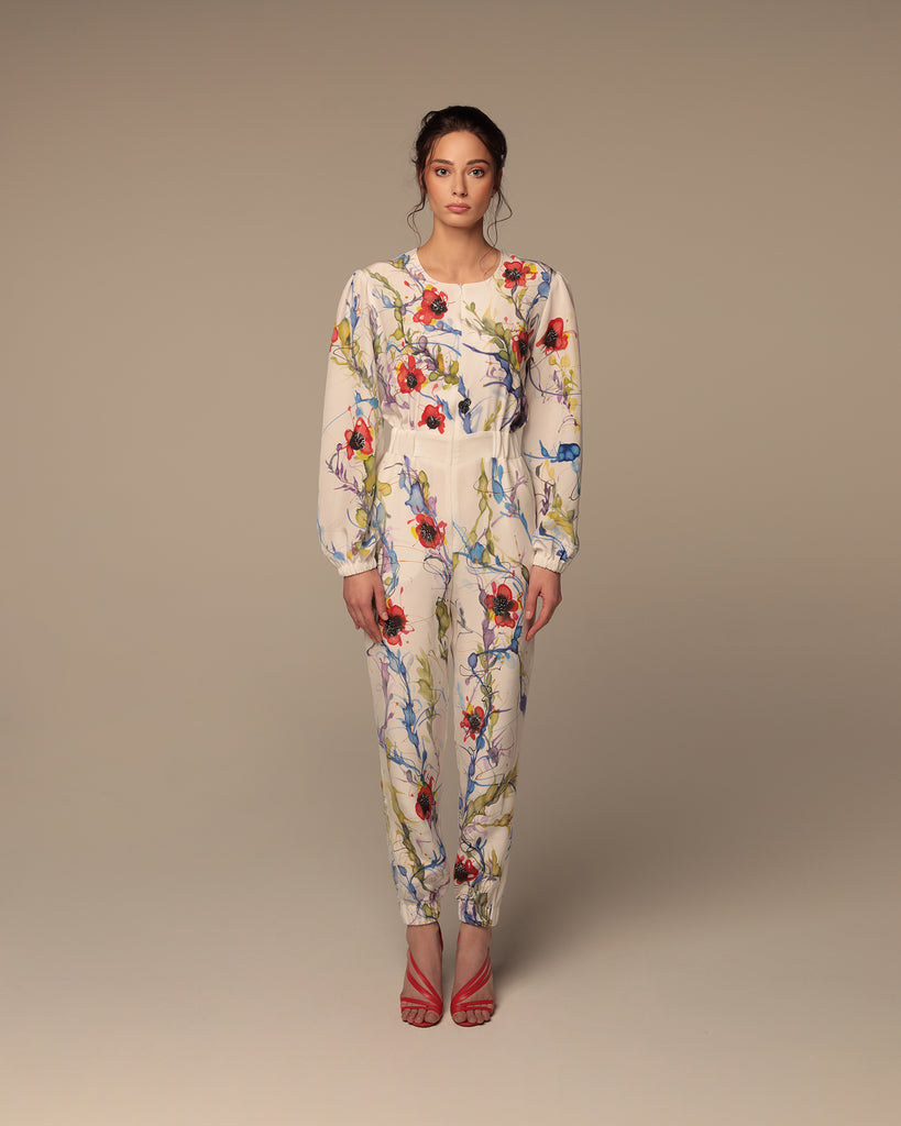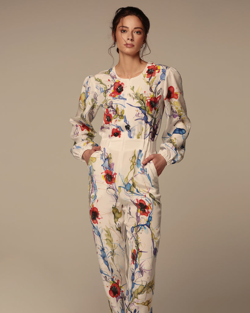 Long-sleeve jumpsuit with central zipper featuring elastic waistband on an off-white base with a multi-colour floral vine print. Side pockets. 100% Crêpe de Chine Silk. Professional dry clean only.