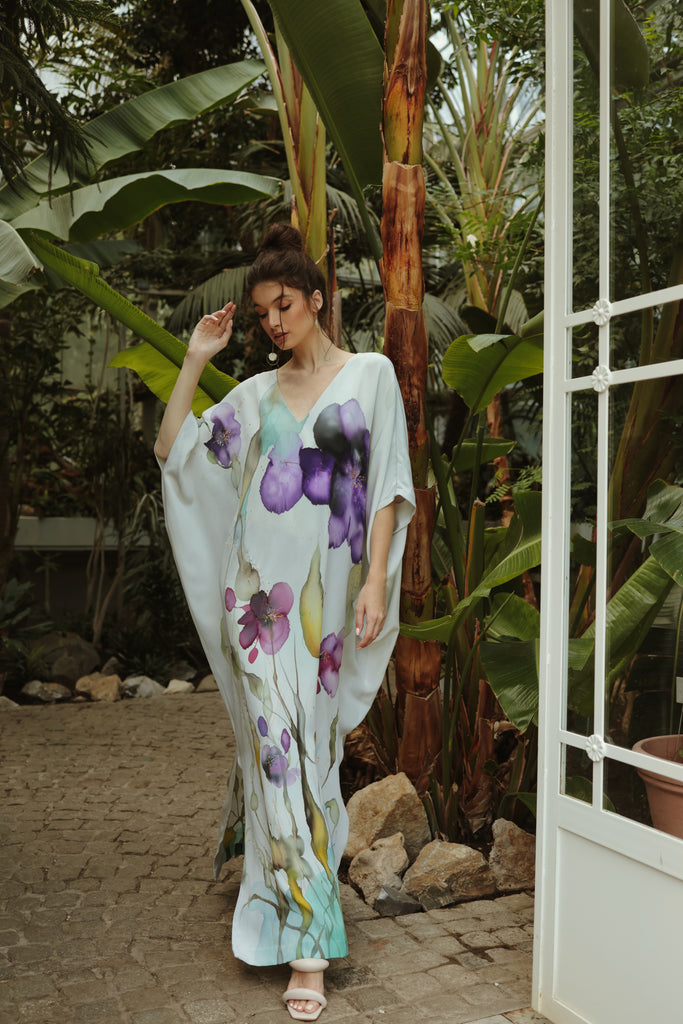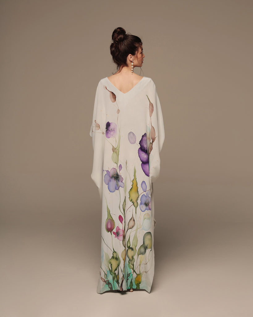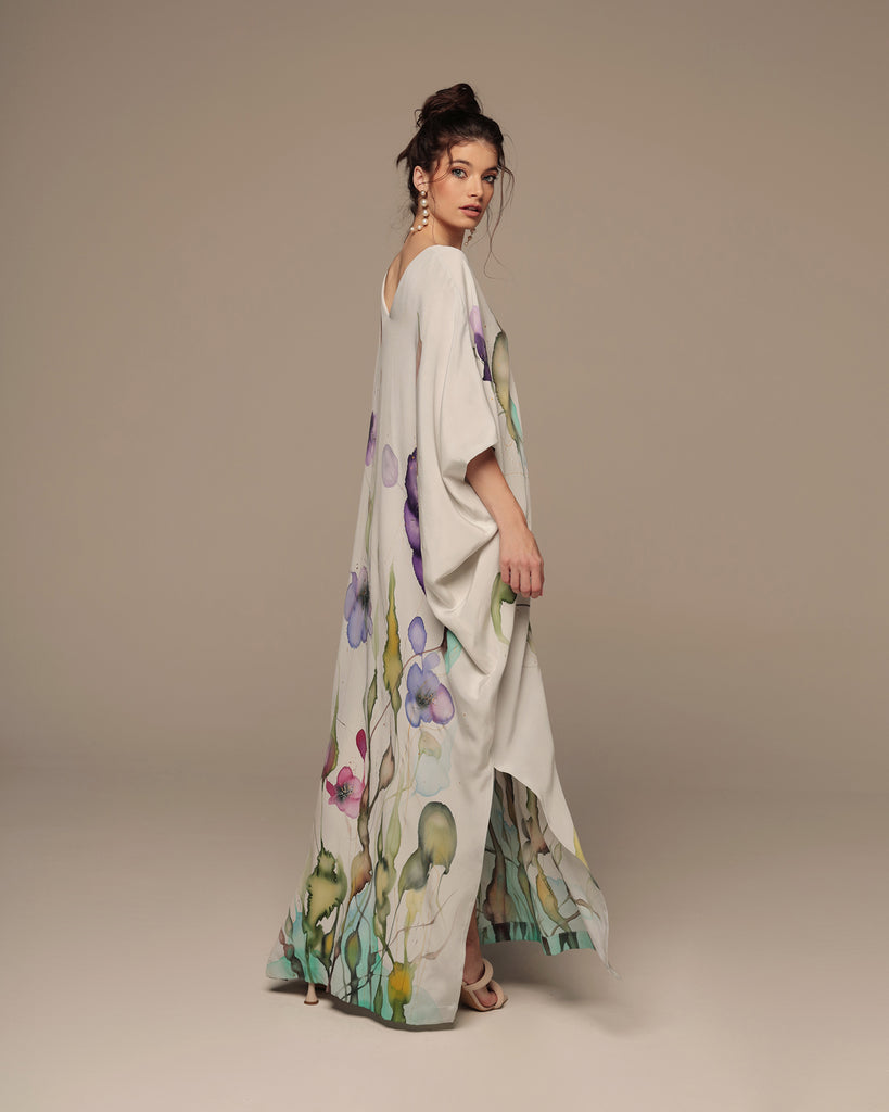 Maxi length caftan robe featuring side slits on a gray coloured base with a multi-colour floral placement print. Loose, comfortable fit. 100% Crêpe de Chine Silk. Professional dry clean only.