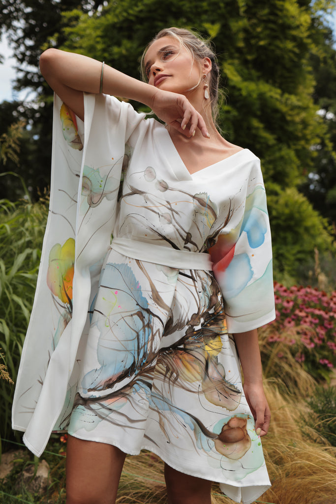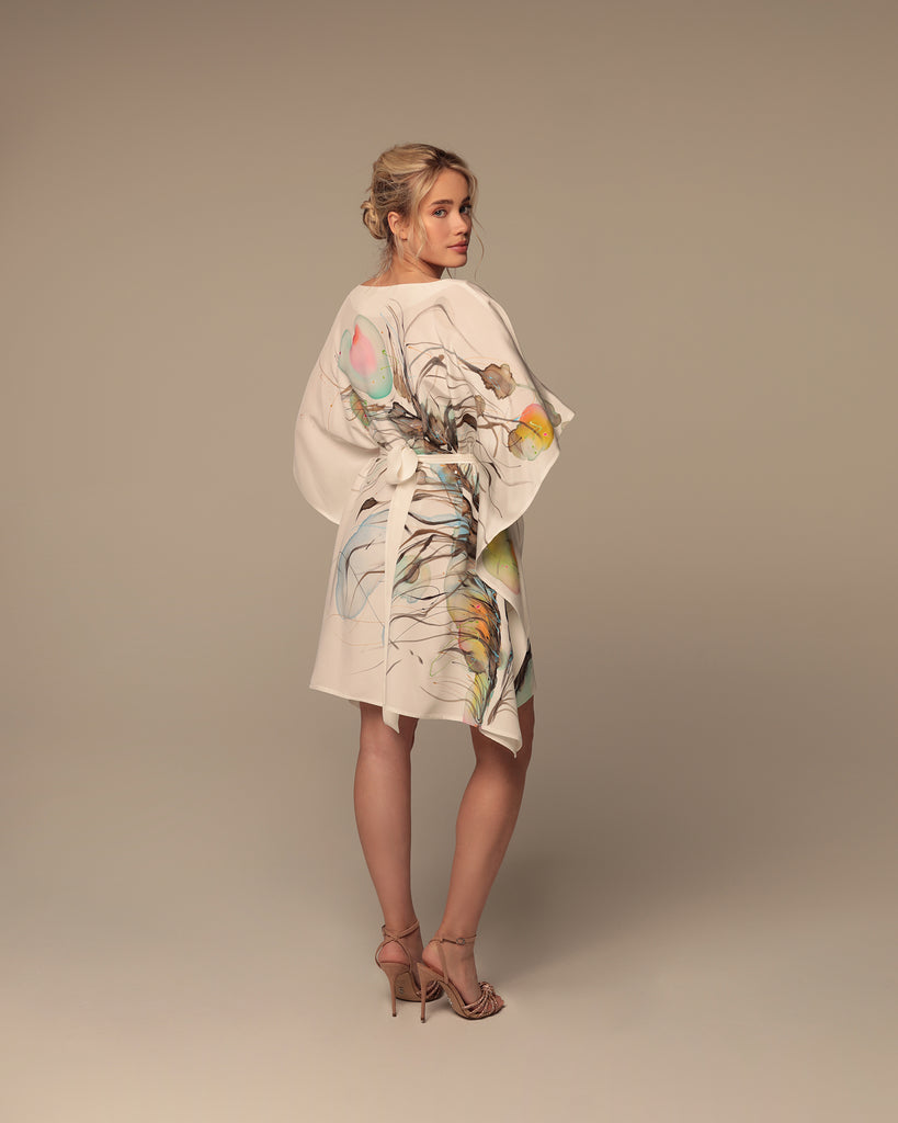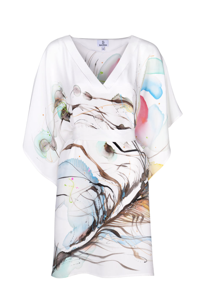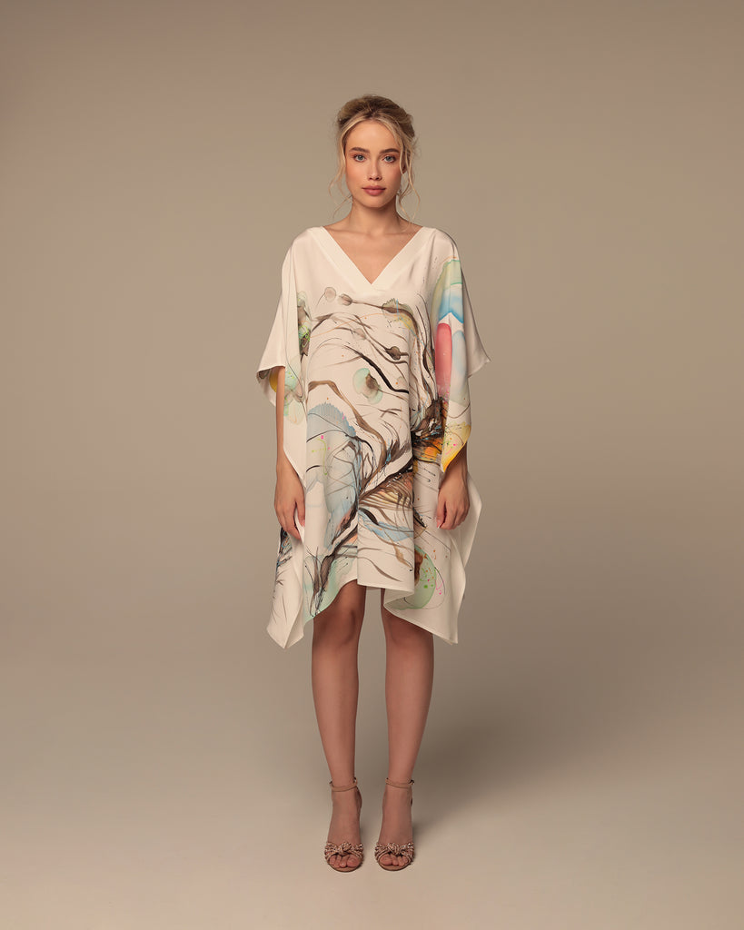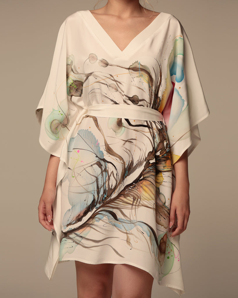 Mini length V-neck caftan dress on an off-white base with a multi-colour abstract feather placement print. Caftan can be worn loosely for a comfortable fit or with the matching belt for a more fitted look. 100% Crêpe de Chine Silk. Professional dry clean only.