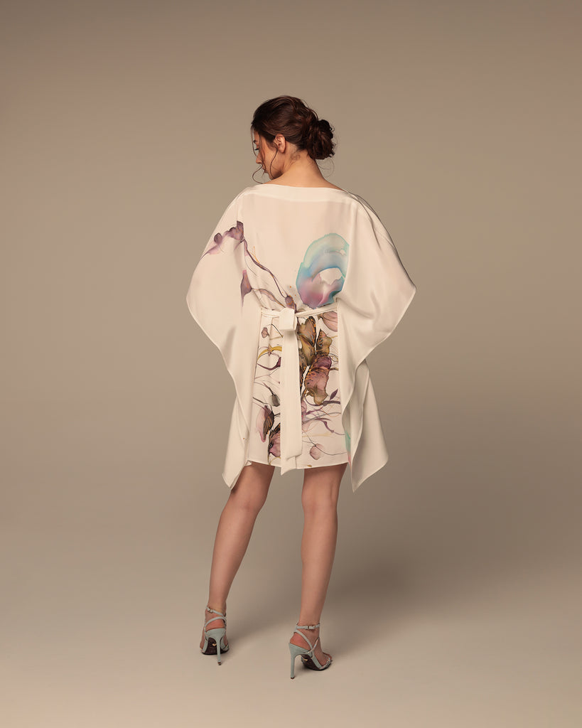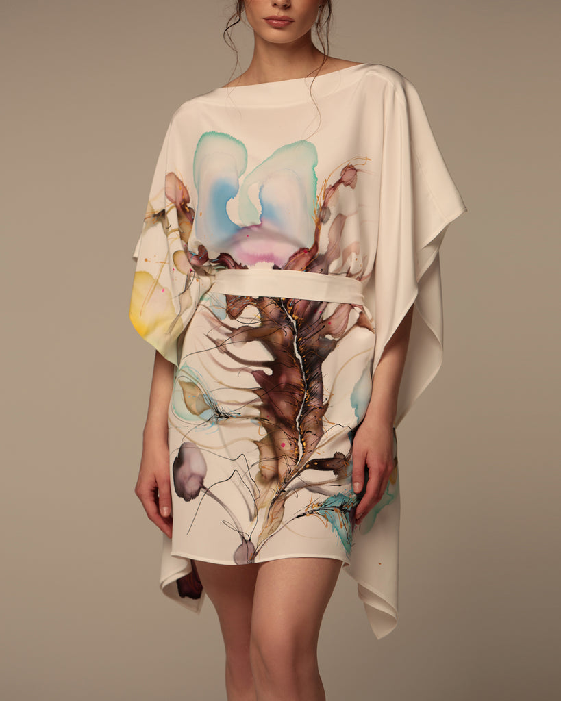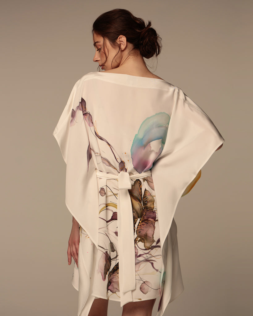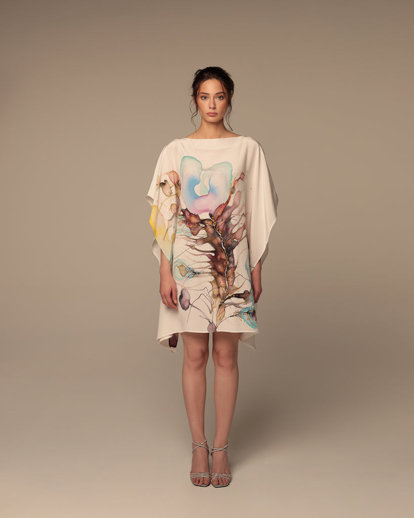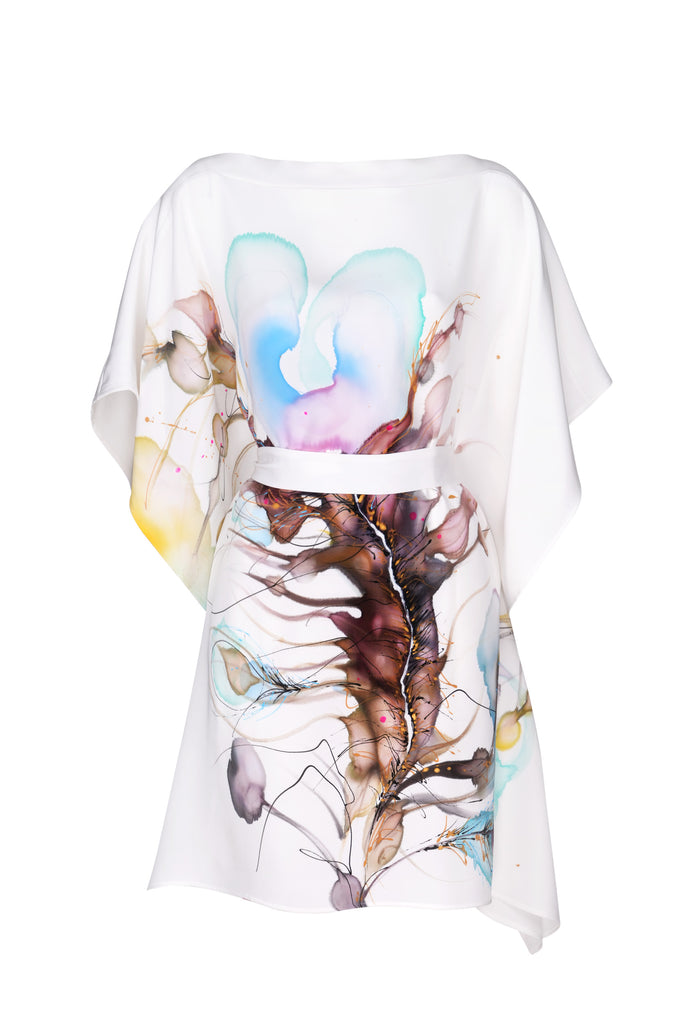 Mini length boat neck caftan dress on an off-white base with a multi-colour peacock feather placement print. Caftan can be worn loosely for a comfortable fit or with the matching belt for a more fitted look. 100% Crêpe de Chine Silk. Professional dry clean only.