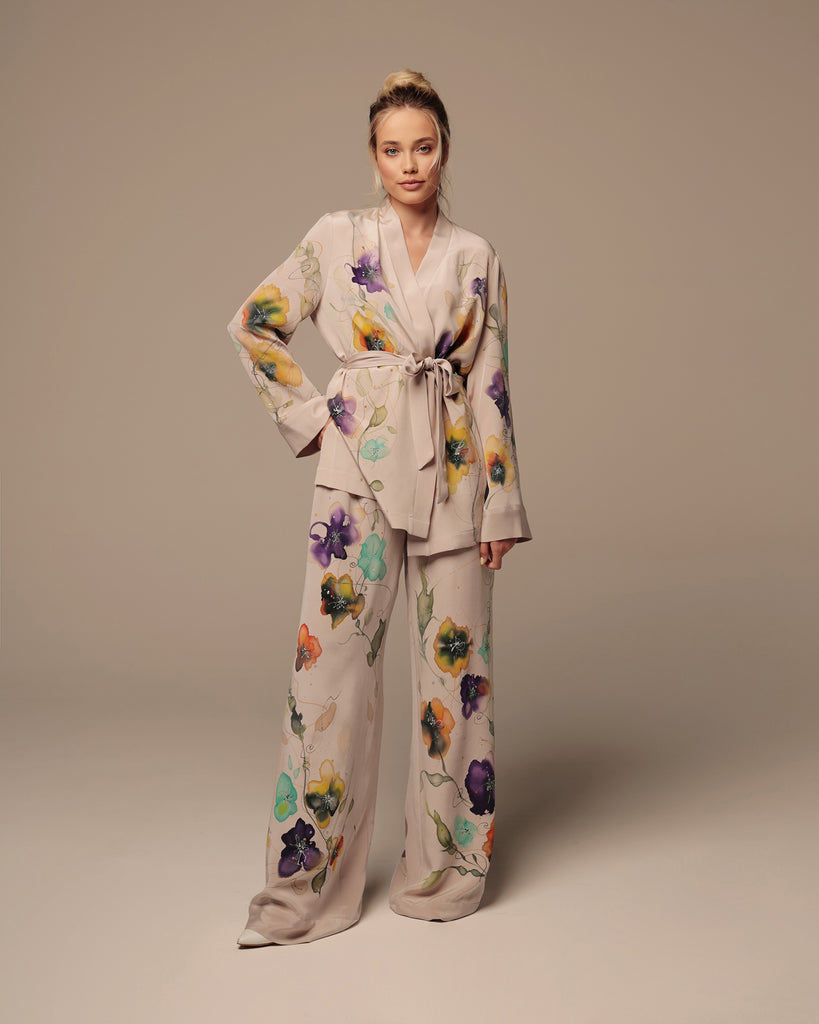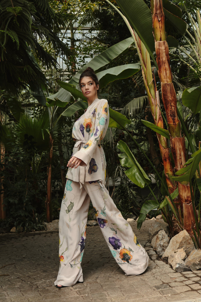 High-waisted wide-leg pants with elastic waistband and side seam pockets on a cappuccino coloured base with a multi-colour floral print. 100% Crêpe de Chine Silk. Professional dry clean only.