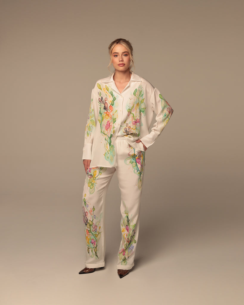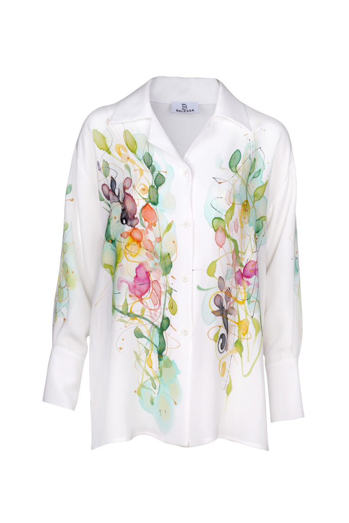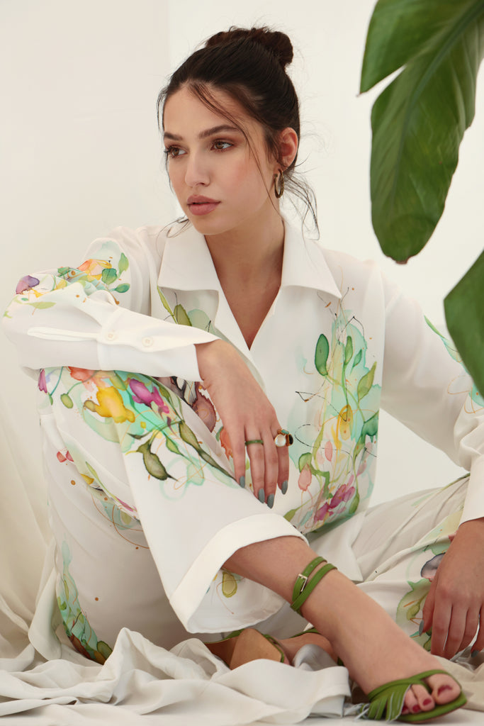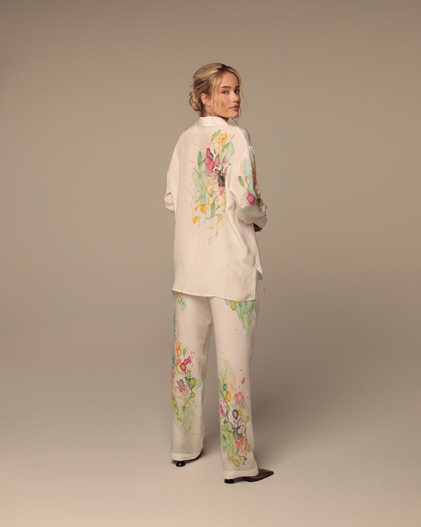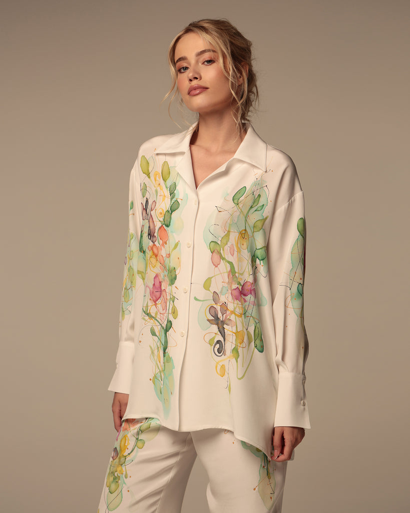 Long-sleeve button-down blouse with accented cuffs on off-white silk with an abstract multi-colour print. 100% Crêpe de Chine Silk. Professional dry clean only.