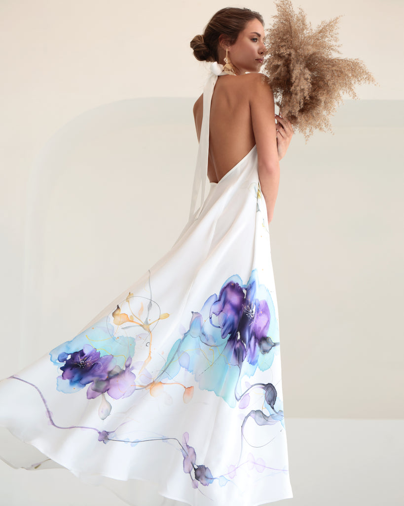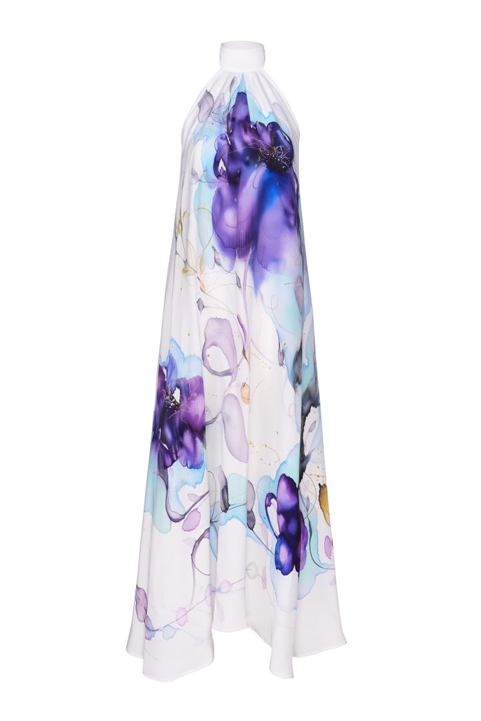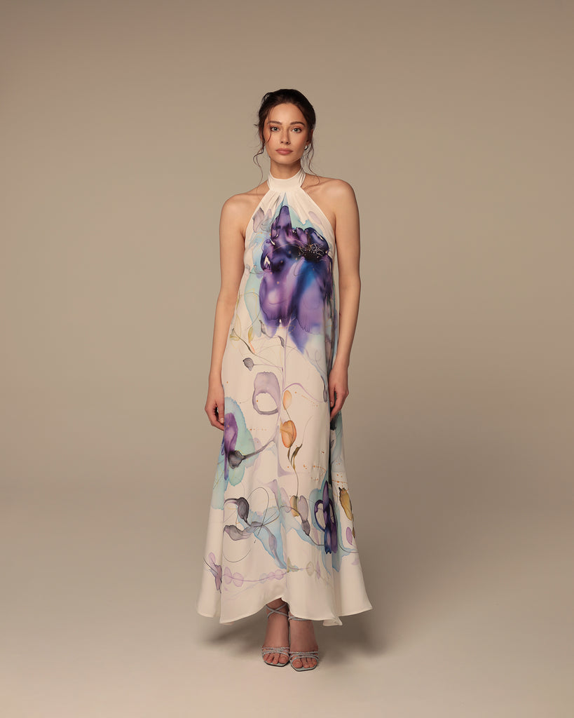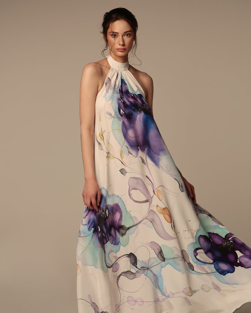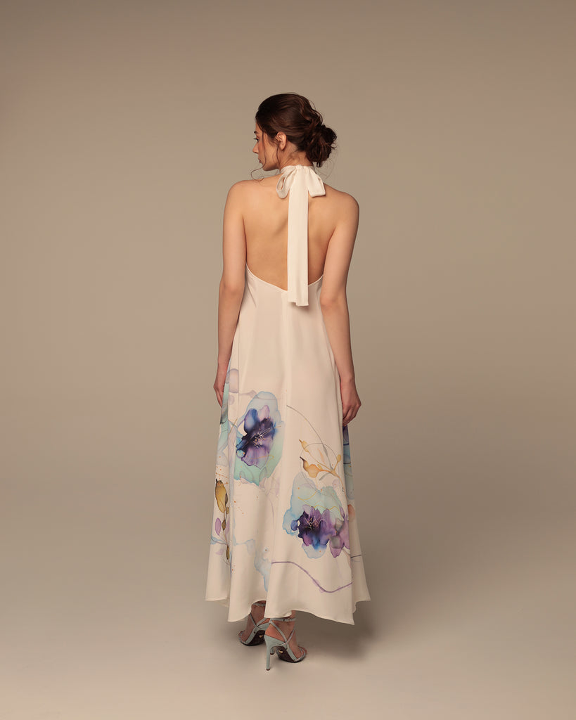 Ankle-length halter dress with low-cut back on an off-white base with a multi-colour floral placement print. 100% Crêpe de Chine Silk. Professional dry clean only.